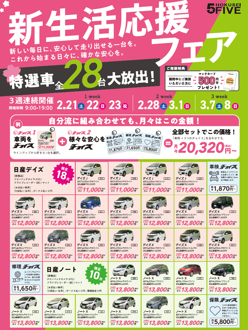 このまま春になってほしいという願いも込めて、特選中古車なんと28台、大放出いたします!