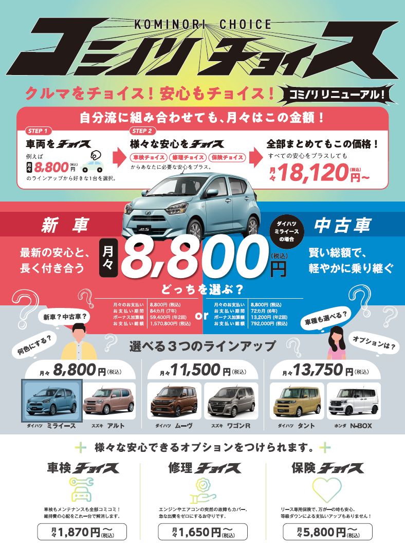 新車or中古車を選べたり、車検・修理・保険を月々支払いで丸ごとオトクにできたり、車種もミライース、ワゴンRやN-BOXなどから選べます!
