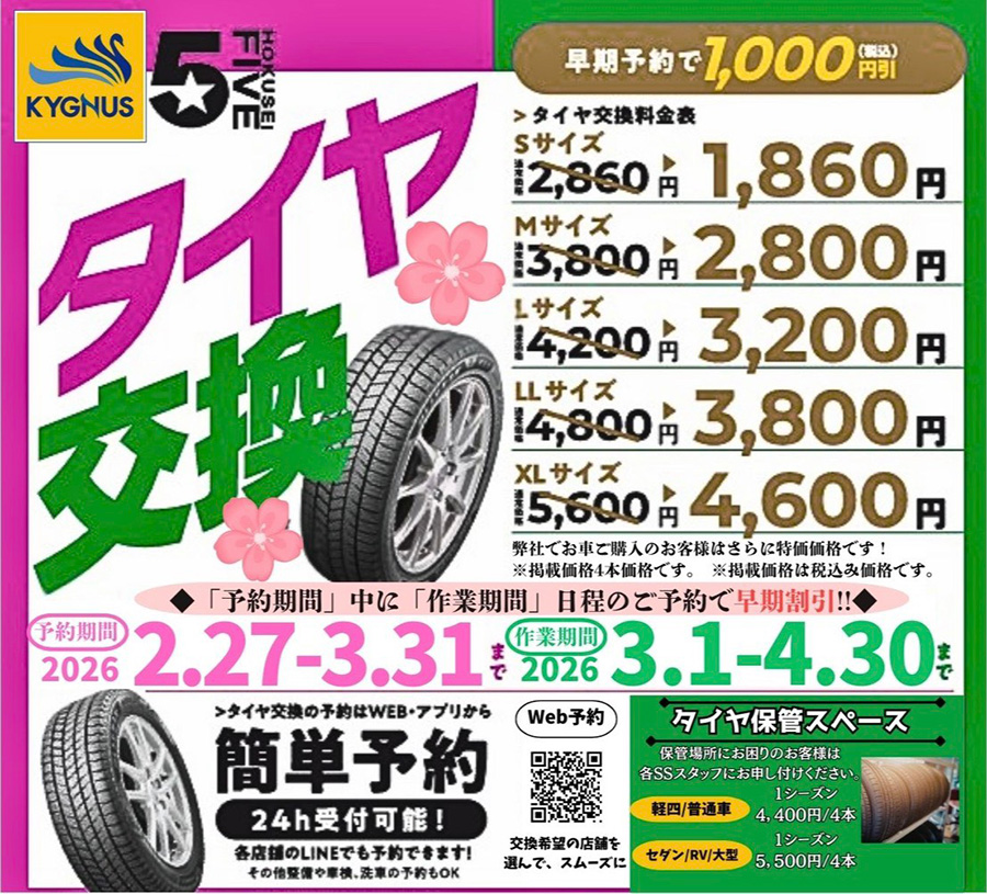 春のタイヤ交換2026★早期予約割引でオトク!